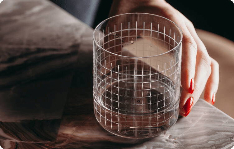 Another example of a calculated choice based on trends and quality is the Nude brand, beloved by designers and restaurateurs. The thinnest and strongest old fashion glass of the Finess Grid series perfectly transmits light and is suitable for serving water or refreshing drinks while guests are waiting.