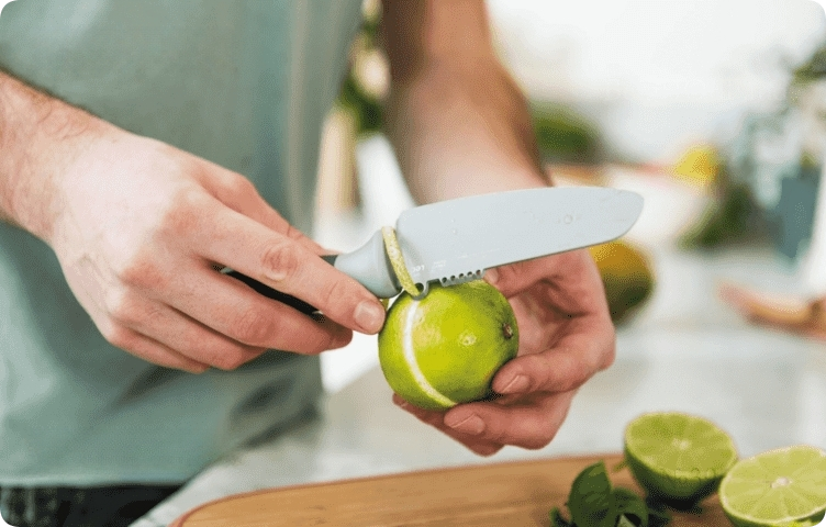 A wide blade with small sharp rings at the end that catch the zest of citrus fruits well is used for cutting thin oblong slices of fruits and vegetables.