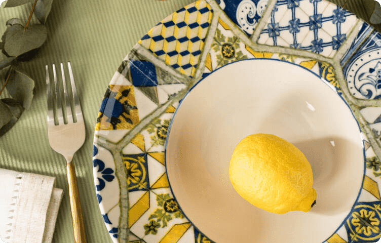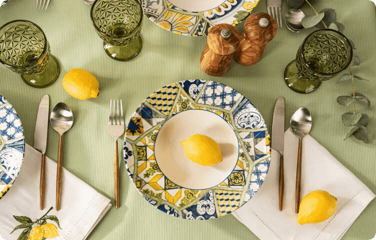 The highlight of our table was the Seaside Maiolica plates from Tognana , which impressed us with a stunning Mediterranean-inspired design with vibrant blue, green and yellow accents. The intricate pattern creates a sense of depth and texture, making each piece a work of art in its own right.