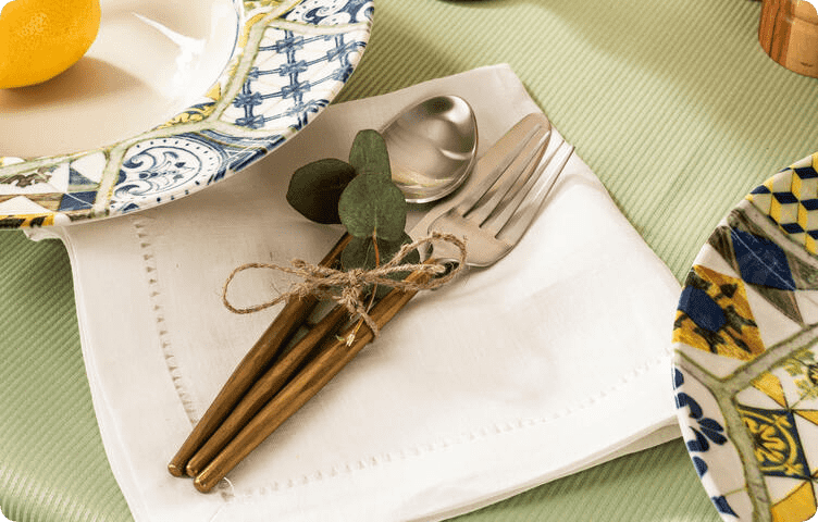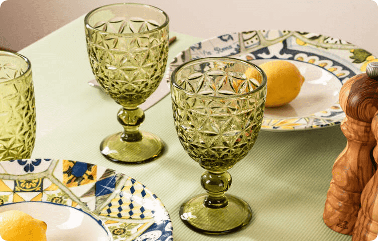 To complement the plates, we chose green glass glasses from Probar . A delicate dark olive shade adds elegance to the table setting and, at the same time, plays off the lighter tone of the tablecloth.
